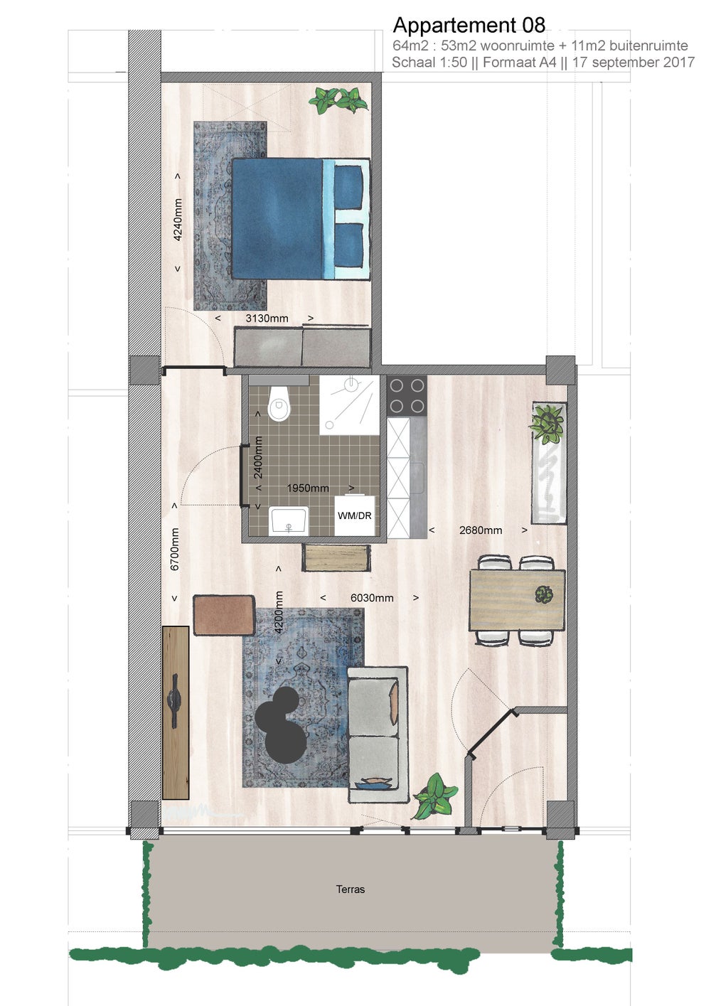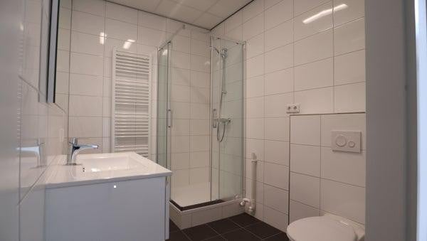 Fully tiled bathroom with shower, bathroom furtniture two softclose drawers, towel radiator, toilet and connection for the washing machine and dryer.