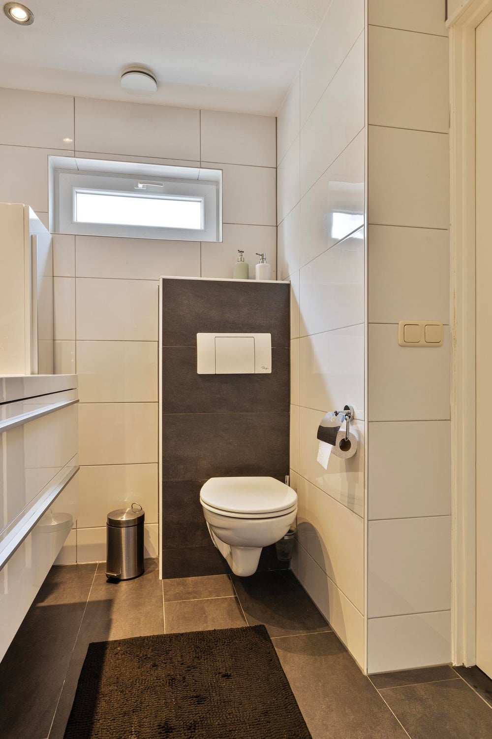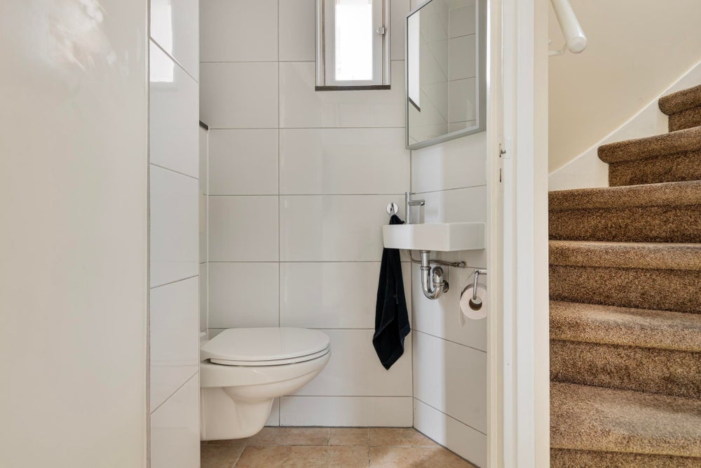 Tiled flooring throughout the entire ground floor, plastered walls and ceiling, electrical meter cabinet (updated meter and fiber optic connection), underfloor heating control unit, and newly tiled toilet with wall-mounted closet and washbasin.