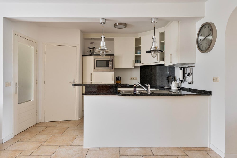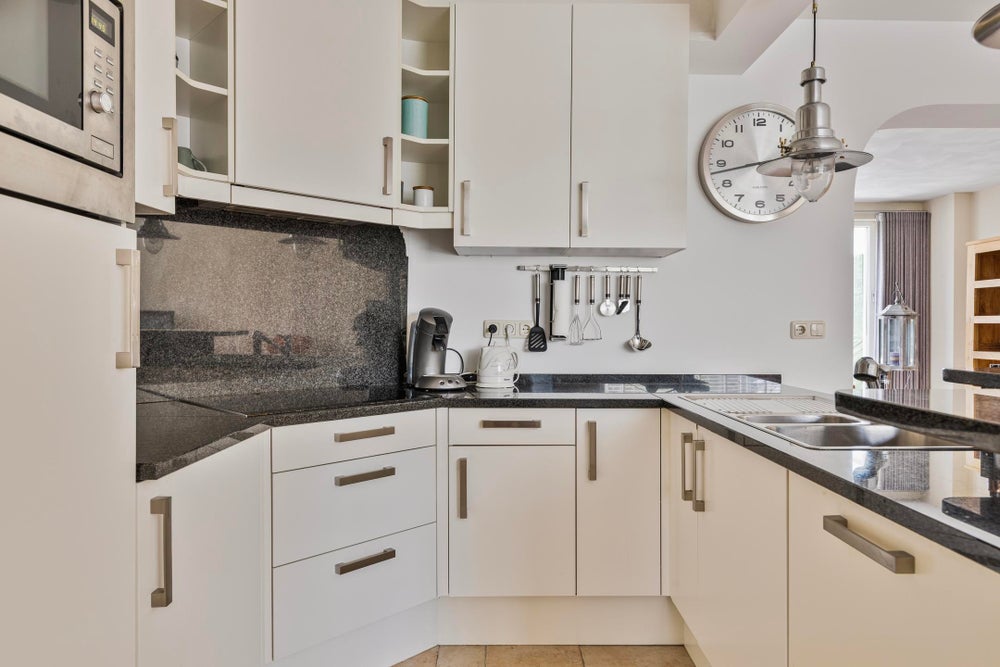 Open-plan kitchen in a U-shaped layout with granite countertop and built-in appliances: induction hob, extractor hood, combination microwave oven, fridge, freezer, dishwasher, and a walk-in pantry.