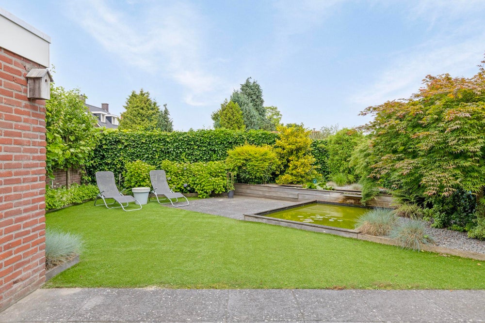 Beautifully landscaped garden with two terraces, artificial grass, wooden borders, and a pond.