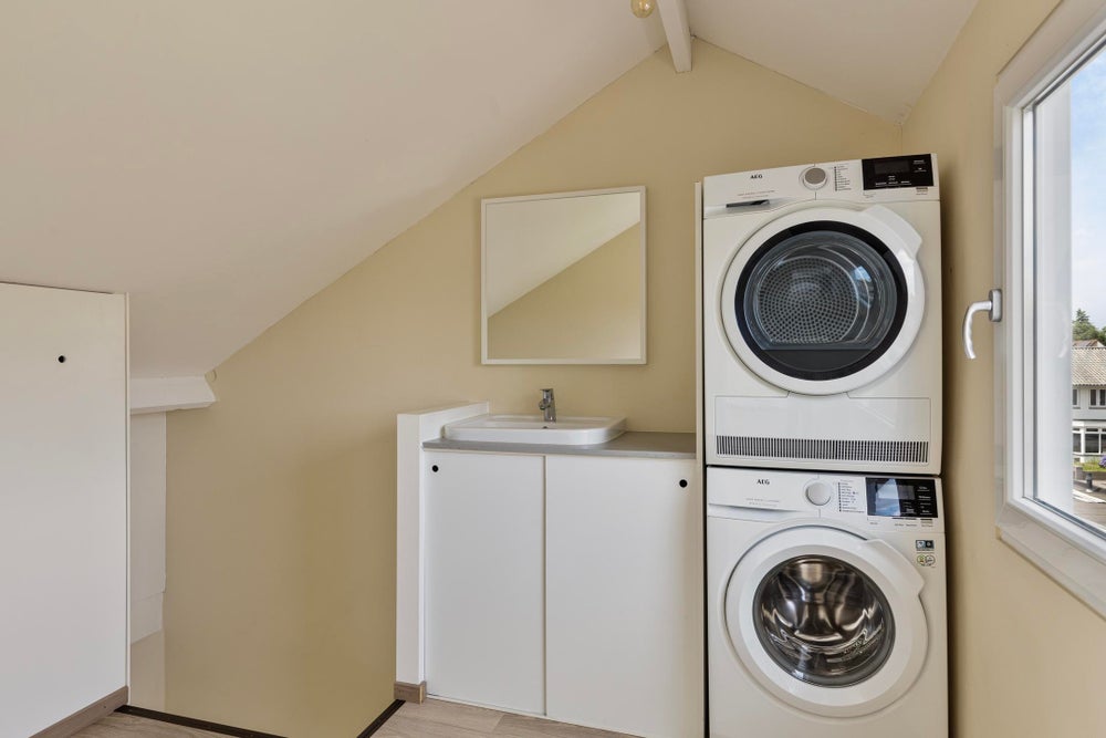 Landing with washbasin, base cabinets, washing machine, and dryer. Storage cabinet housing the central heating boiler.