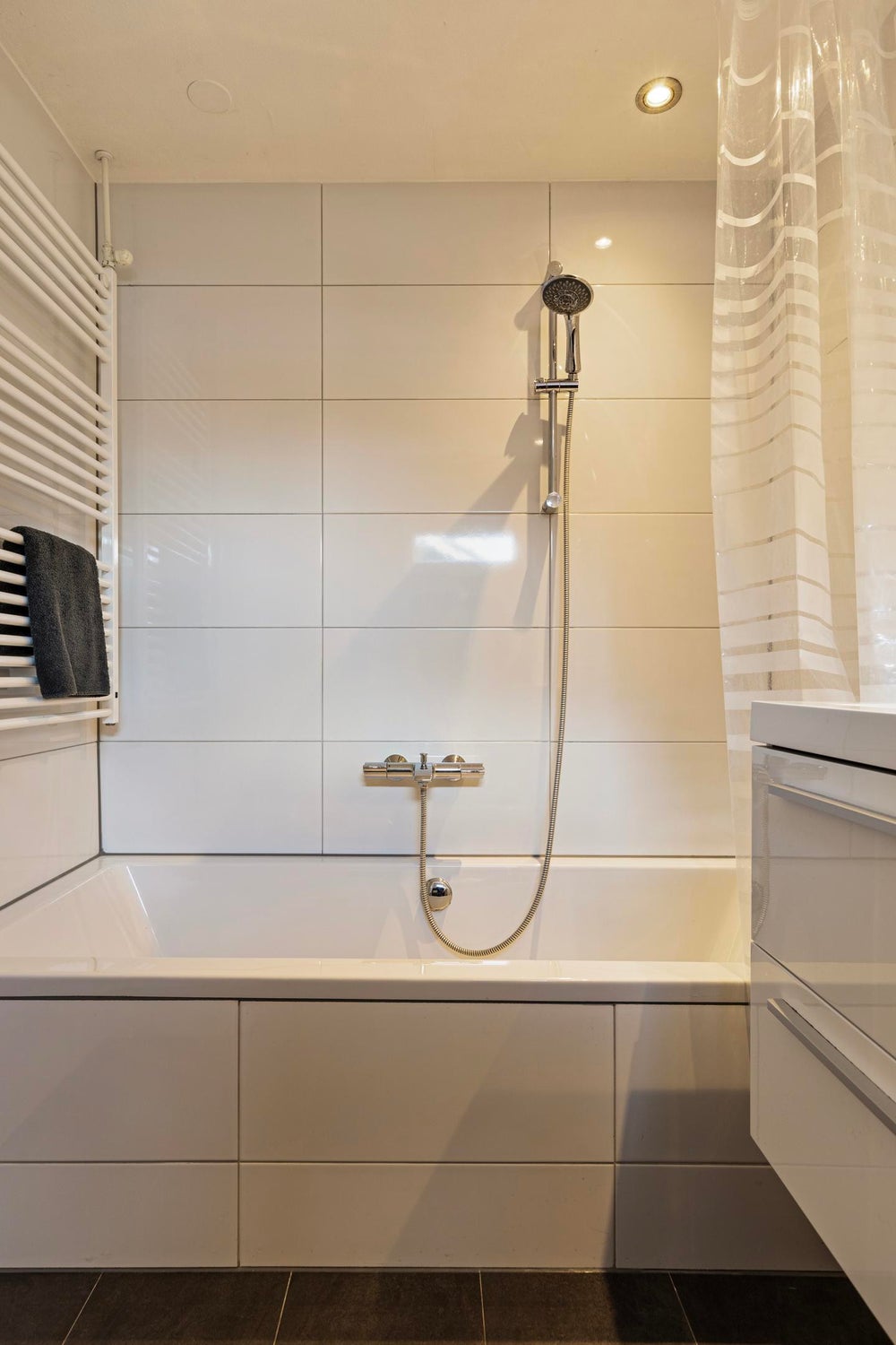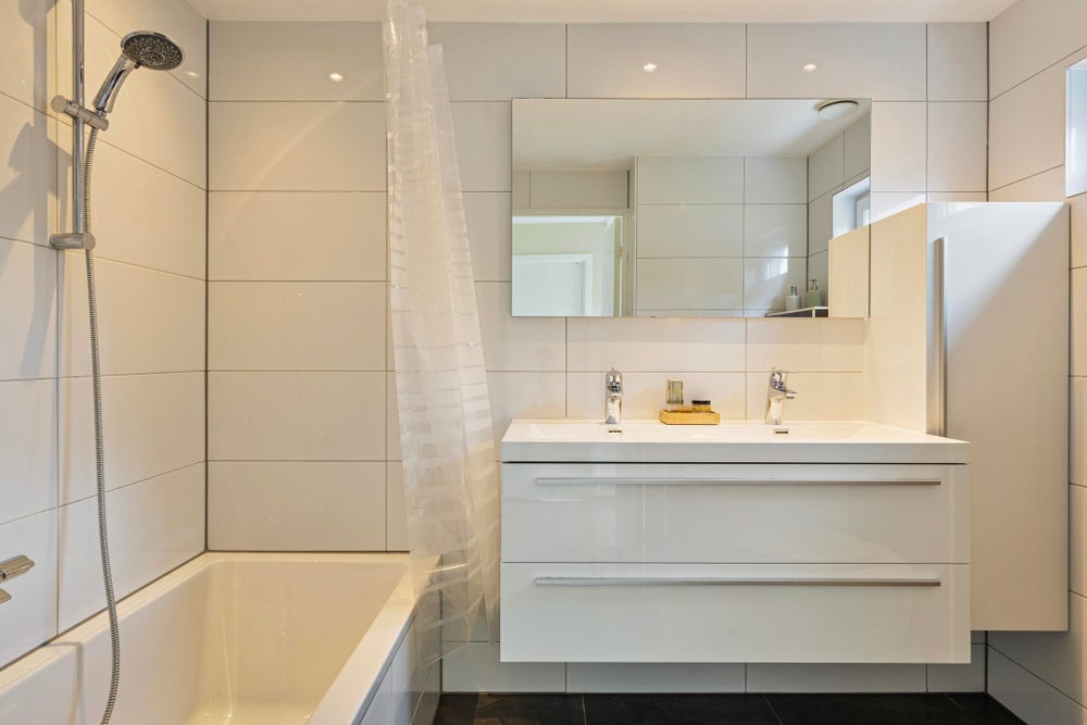Newly tiled bathroom with bathtub/shower combination and thermostat tap, double washbasin with cabinet and drawers, wall-mounted toilet, and recessed ceiling spotlights.
