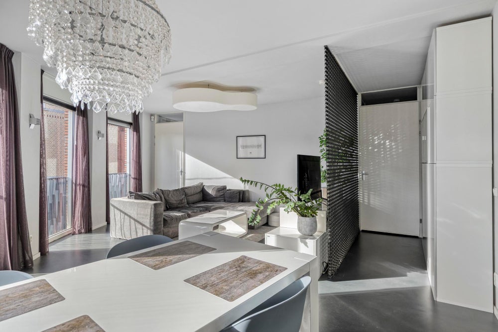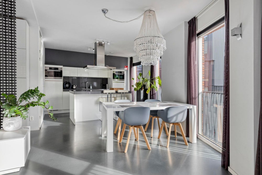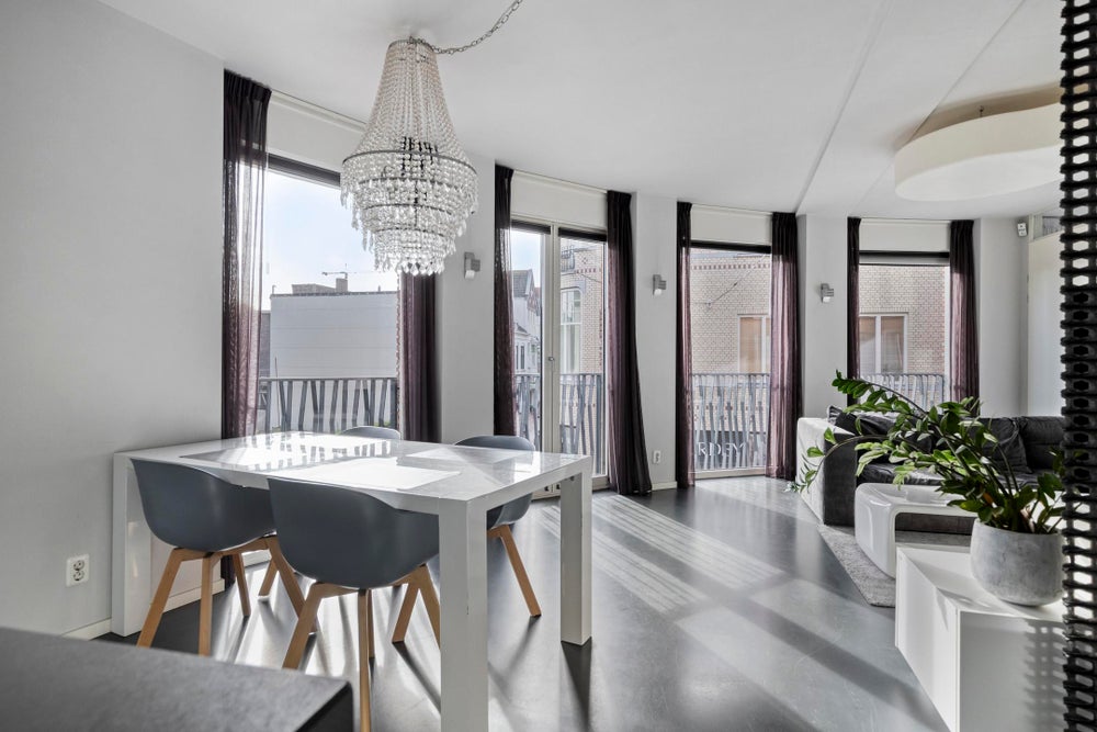 Sfeervolle woon- / eetkamer met openslaande deuren naar Frans balkon. De woon- / eetkamer geniet door de royale raampartijen veel lichtinval. Doordat het appartement op een hoek is gelegen heeft het een fraaie licht inval.