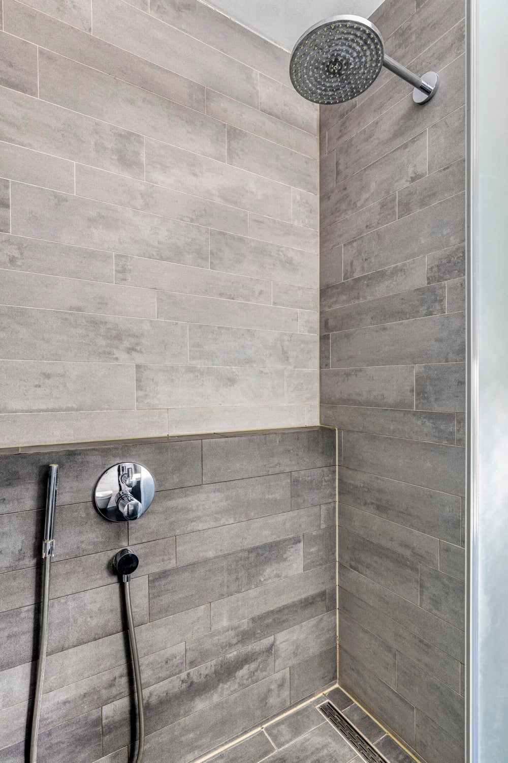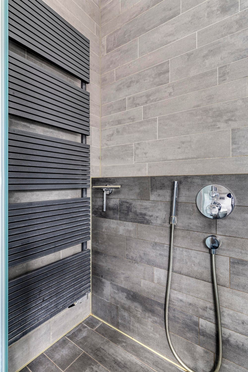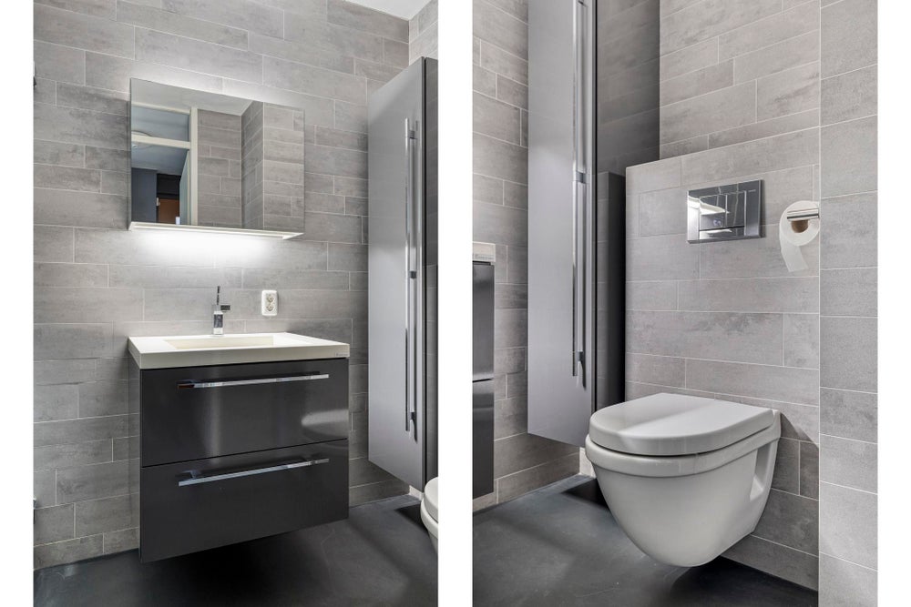 Luxe betegelde badkamer met douche voorzien van thermostaatkraan, wastafel met verlichte spiegel en toilet.