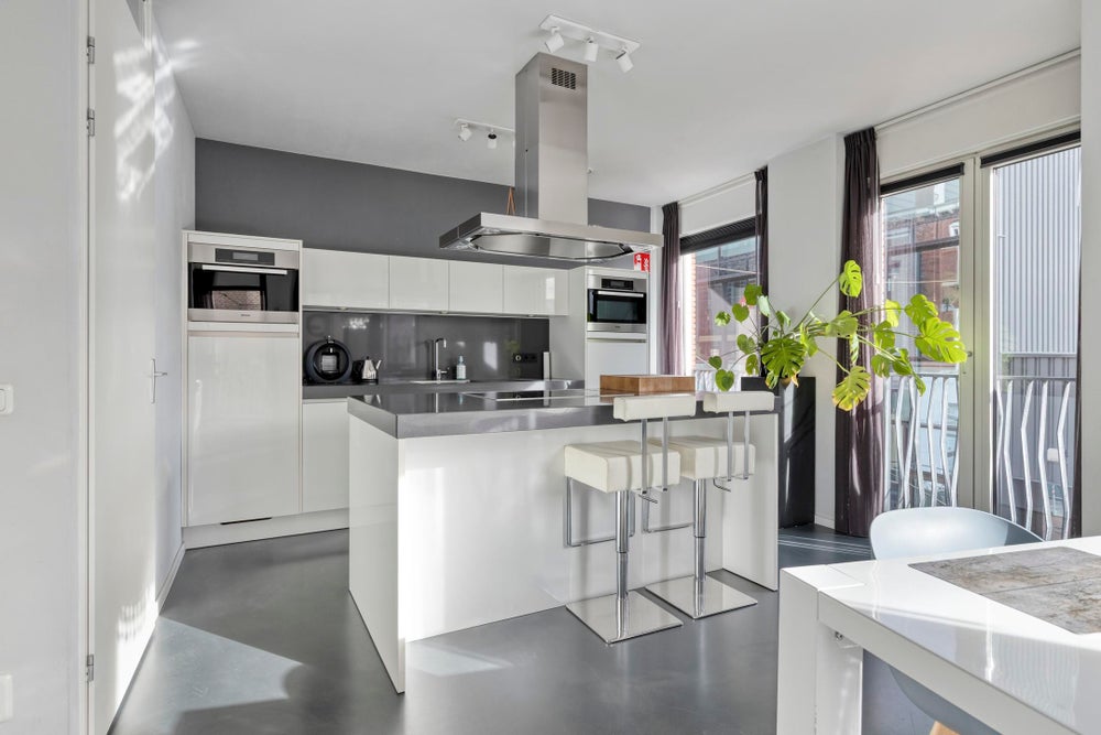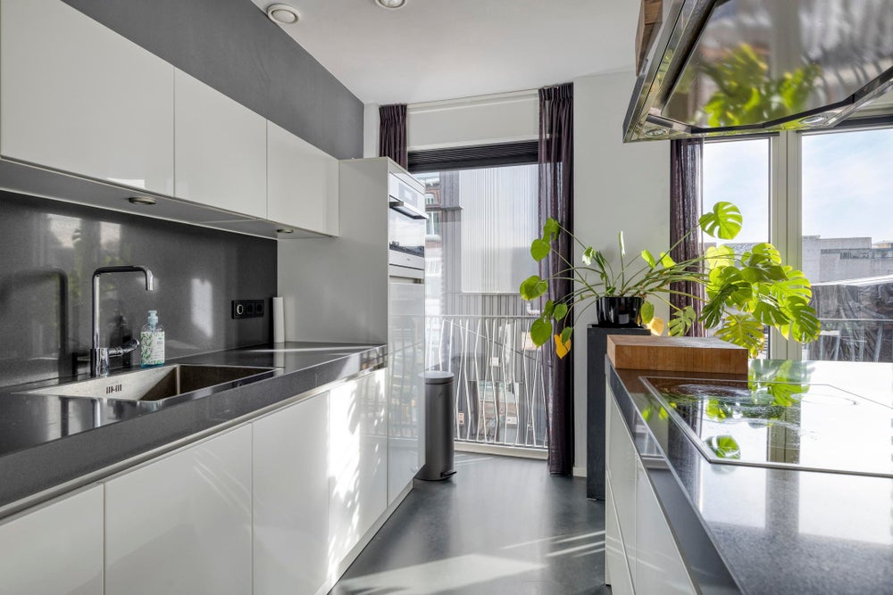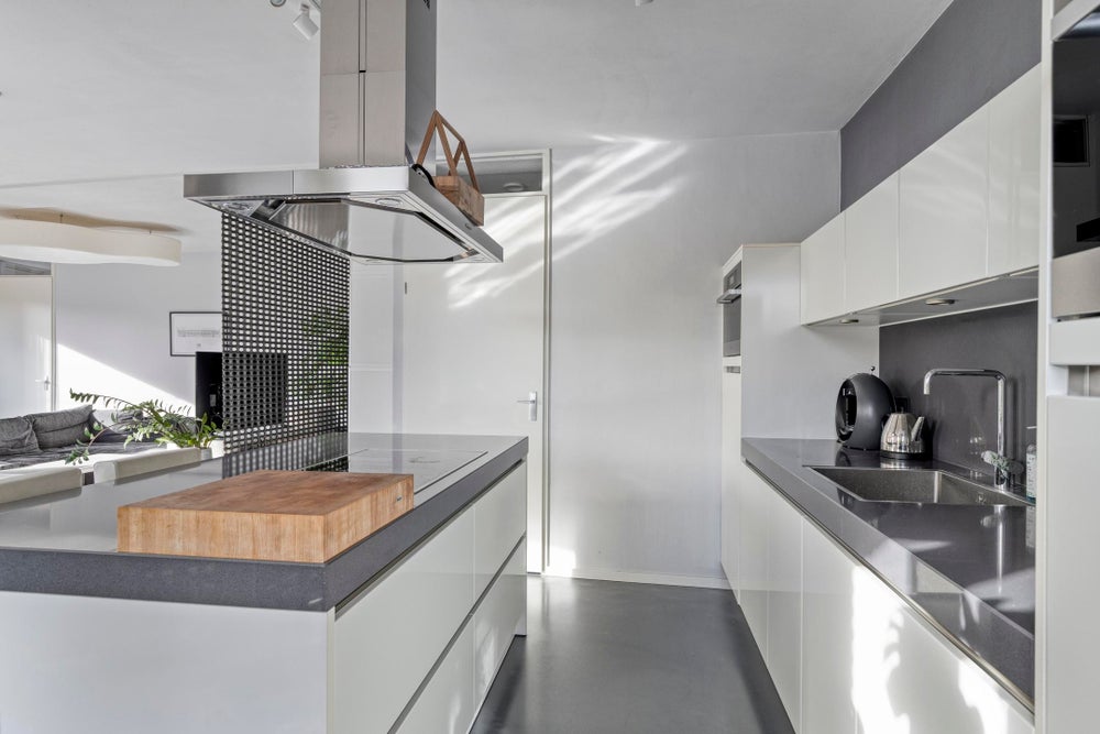 Open keuken met moderne keukeninrichting. De keuken beschikt over een spoelbak, een inductiekookplaat met RVS afzuigkap, een vaatwasser, een combimagnetron, stoom oven en diverse onder- en bovenkasten. Vanuit de keuken is de ruime bijkeuken/berging alwaar zich onder andere de wasmachine en droger bevinden.