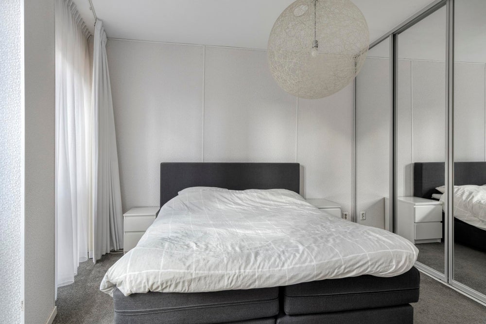 Fraaie hoofdslaapkamer met openslaande deuren naar een Frans balkon met deels gestucte wanden en voorzien van antraciet kleurige vloerbedekking en vaste linnenkast.