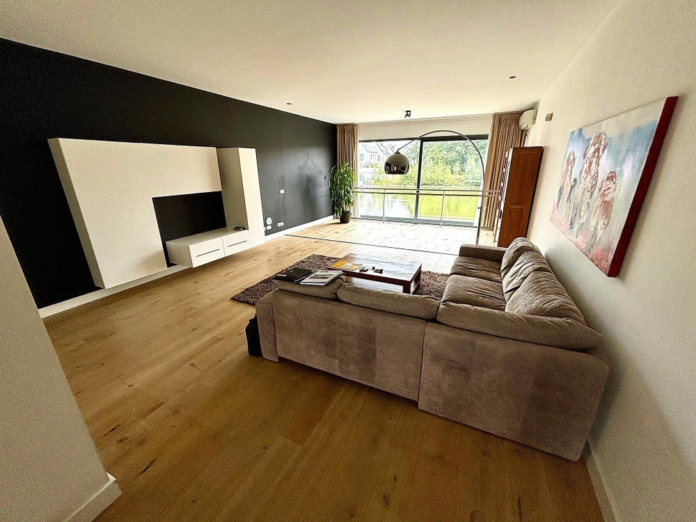 - Ruime en lichte woonkamer met houten parketvloer en prachtig uitzicht door de grote glazen pui aan het water